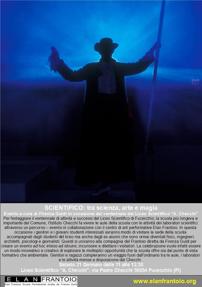 The Liceo Scientifico in Fucecchio is twenty years old! To celebrate the oldest and most important school in town, the Istituto Checchi is planning an event entitled "SCIENTIFICO: between science, art and magics", in collaboration with the centre for performative arts ElanFrantoio. The event will take place on Saturday 21 January, from 11am to 12.30 at the school venue in Via Padre Checchi. Under Firenza Guidi's Artistic Direction the school will make its science labs and workshops come to life through a journey-event created with the participation of Liceo current students alongside Guidi's performers. Ex-students, now engineers, physics, architects, psychologists and even famous journalists, will join in the celebrations. The project intends to delight and instruct by taking open-day visitors through the multiple learning opportunities that the school offers. A journey out-of-the-ordinary unravelling through labs, corridors and classrooms in a fusion of science, art and magics. At the end of the event parents and potential students will have the opportunity to ask questions over light refreshments. All welcome!