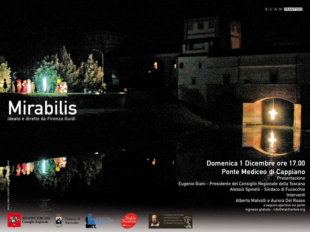 Questa l'epigrafe ancora visibile sulle facciate delle torri del Ponte Mediceo di Cappiano. Per sua vera natura un ponte ha la funzione di unire, di mettere in contatto due realtà non comunicanti per vie normali. Ecco che il Ponte di Cappiano diventa mirabilis in quanto unione tra due sponde, due mondi, due persone, due diverse realtà e due archi temporali, il Passato e il Futuro.